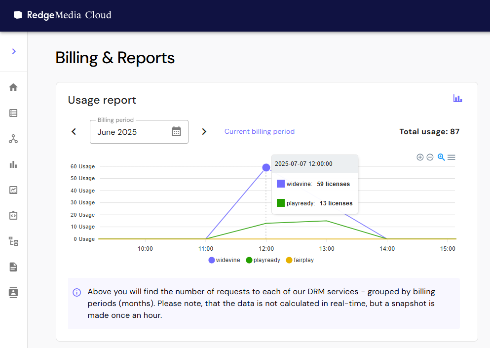 Redge Media Cloud DRM comes with a dashboard and reporting tools, giving clear insight into license usage trends over time.